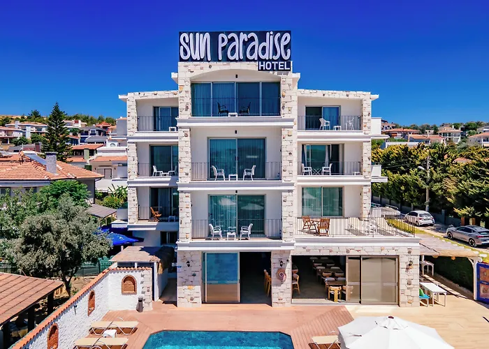 Sun Paradise Hotel ligger i Çeşme, 3 km fra Çeşme Slot, og byder på en swimmingpool. Overnatningsstedet byder på 27 gæsteværelser, som er indrettet med en balkon, kaffe- og tefaciliteter, et fladskærms TV med satellitkanaler for et behageligt ophold i Çeşme.